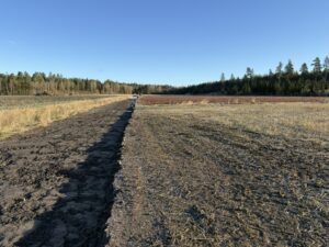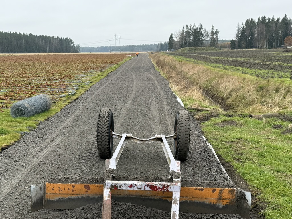 2024 syksyllä oli vielä paljon tehtävää, ja sitä täällä on kyllä edelleenkin. Mutta syksyllä 2025 saatiin kuitenkin tehtyä uusi tie pellolle. Ensin poistettiin reunasssa ollut aita, sitten kaivettiin auki verkon takana oleva oja. Tämän jälkeen kuorittiin 15-20 cm pintamaata pois, laitettiin salaojaputkia tasaisin välein vettä varten. Putkien päälle suodatinkangas ja kankaan päälle sitten mursketta. Suorempi, nopeampi ja vähemmän naapureita häiritsevä baana vie meidät ja asiakkaat lähemmäksi uusia peltoja.